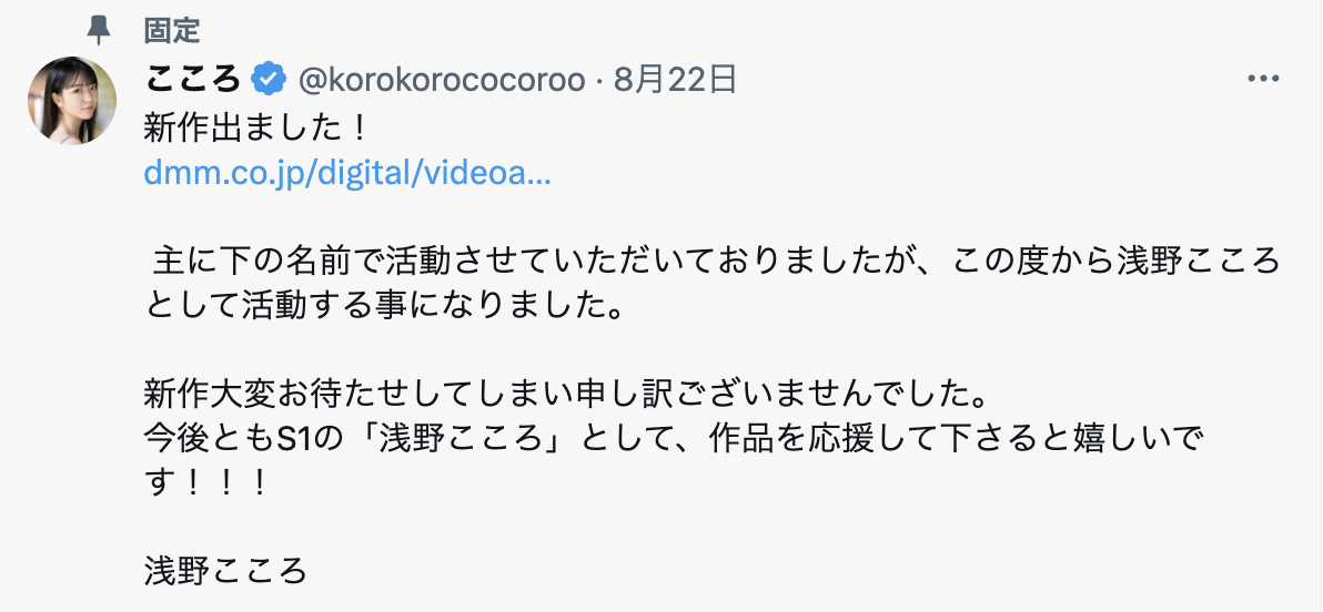 昨天看到作品情报时我以为是S1打错了,但后来看了官网和Fanza(DMM)全都独立建了浅野こころ(浅野心)的栏位我就知道这不是名字打错,再加上事务所BStar之前宣布她OFF会的时候就没有再叫她歌野こころ(歌野心)了,所以就是她改名字了⋯