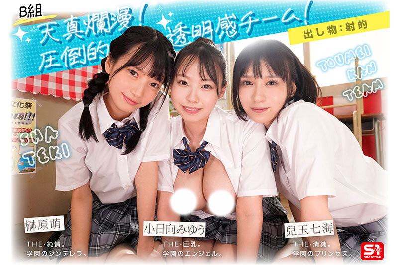 剧情是这样的,11位女优被分成三组在学园祭摆摊比赛,谁得到最多男性的青睐就可以在修学旅行多一天可以去玩耍,所以大家都拼了ー第一组是「未歩なな(未步奈奈)」、「川越にこ(川越铃子)」、「白上咲花」以及「早坂ひめ(早坂姬)」,她们的摊位是「ヨーヨー釣り」、也就是钓水球,男优会拿着用绵绳做的钓竿把池子里的水球勾上来,里面会有「奖励」,至于是什么奖励那自然不用说啦,就是享受四位美少女的服务: